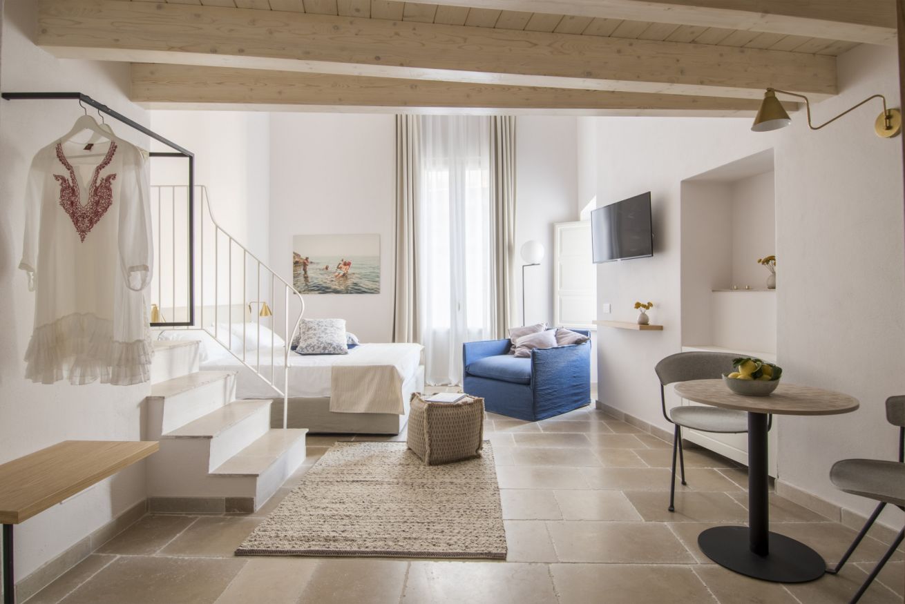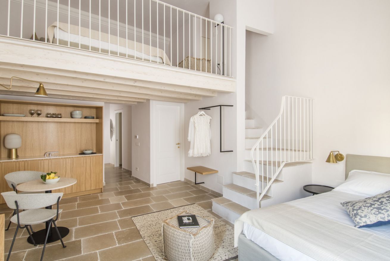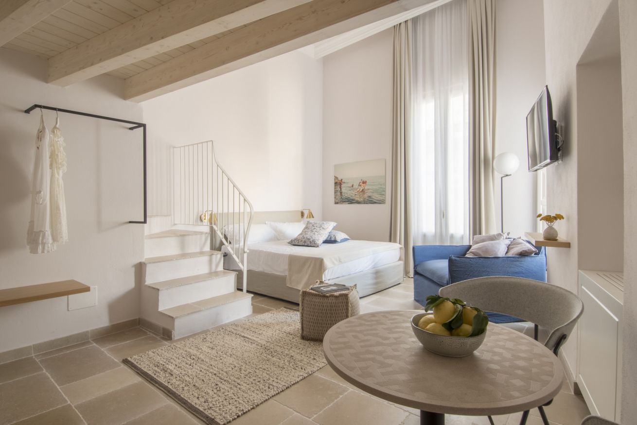 L'appartamento Family ha una vista suggestiva su due delle più belle e famose chiese di Monopoli, la Cattedrale e la Chiesa del Purgatorio. Questa tipologia offre una maggiore comodità data dalle dimensioni degli spazi più confortevoli, ed inoltre può ospitare comodamente 4 persone grazie alla suddivisione data da un soppalco che permette di avere due comodi letti matrimoniali sui diversi livelli.