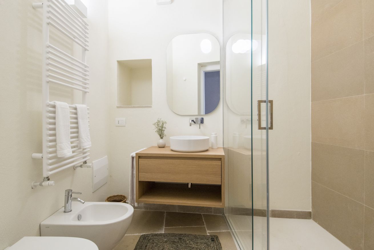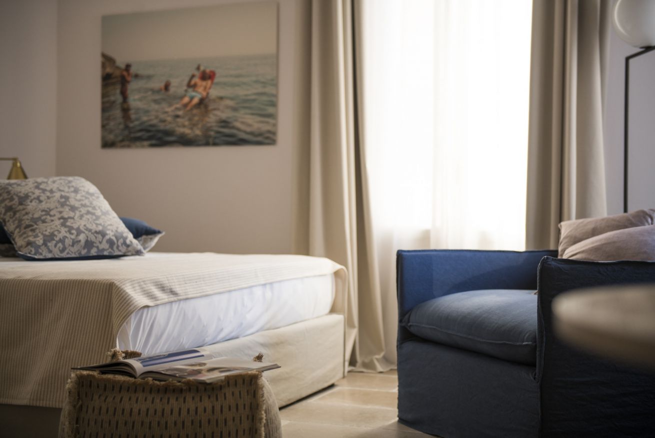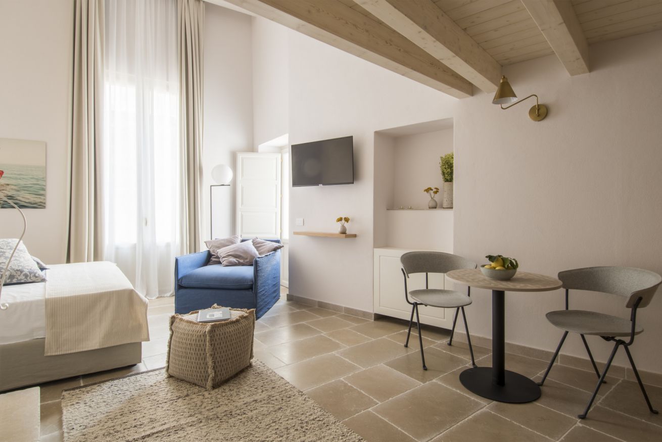 L'appartamento Family ha una vista suggestiva su due delle più belle e famose chiese di Monopoli, la Cattedrale e la Chiesa del Purgatorio. Questa tipologia offre una maggiore comodità data dalle dimensioni degli spazi più confortevoli, ed inoltre può ospitare comodamente 4 persone grazie alla suddivisione data da un soppalco che permette di avere due comodi letti matrimoniali sui diversi livelli.